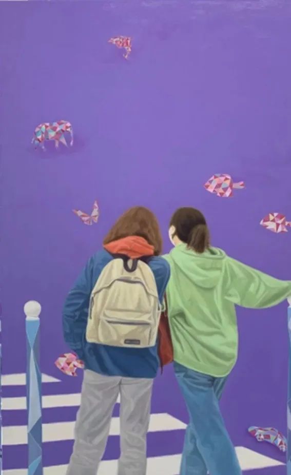 田洪蒙和黄誉二人作品虽都是以人物表现为主题,同样运用具象写实手法,但作品却体现出了迥异的艺术思维和创作特色。田洪蒙的《观·景》以描绘大学生的青春生活为题材,体现出大学生的朝气蓬勃和对未来的展望。黄誉的《禁锢》将人物和太湖石相结合并以红丝线相连,以象征性的手法体现了作者个人对社会与生活的深刻感悟与思考。