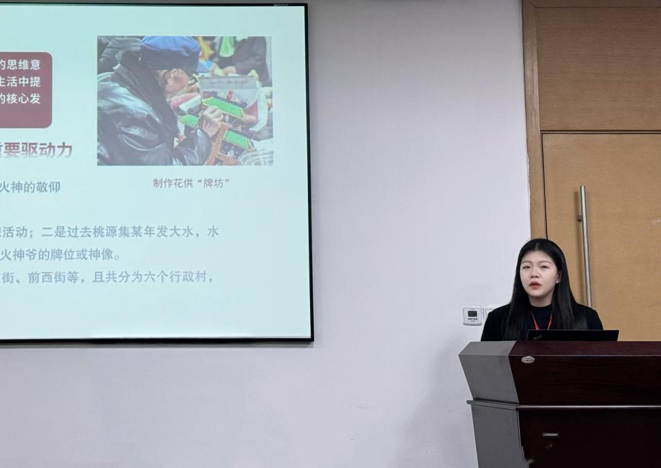 邢怀焱在“民艺谱系:历史话语与地方编码”分论坛上,做了题为《文化符号视域下探究民俗活动的生成与延伸——以菏泽曹县桃源花供会为例》的学术报告。邢怀焱以文化符号为研究基点,以菏泽曹县桃源花供会作为研究对象,通过剖析文化符号的内在意义特性,结合实地田野调查所获取的丰富资料,详细阐述了桃源花供会的现状,并从区域性民俗文化认同及民众共同审美价值的视角,为民俗活动的发展研究提供了生动的现实案例。