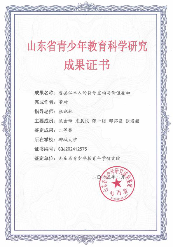 2025年2月课题《曹县江米人的符号重构与价值叠加》荣获“山东省青少年教育科学规划项目大学生学术课题”省级成果二等奖;