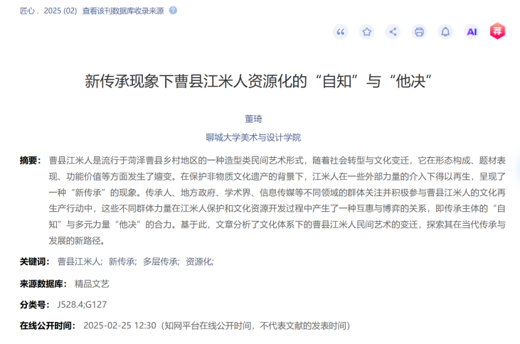2025年2月论文《新传承现象下曹县江米人资源化的“自知”与“他决”》发表于《匠心》;
