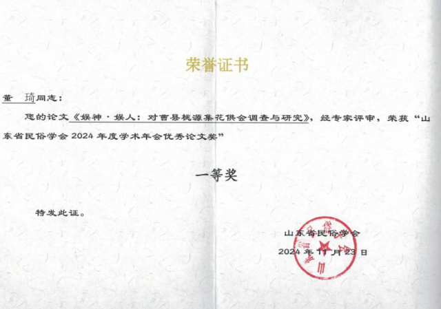 2024年11月论文《娱神・娱人:对曹县桃源集花供会调查与研究》入选“非物质文化遗产与新时代社会发展”学术研讨会暨山东省民俗学会2024年年会;