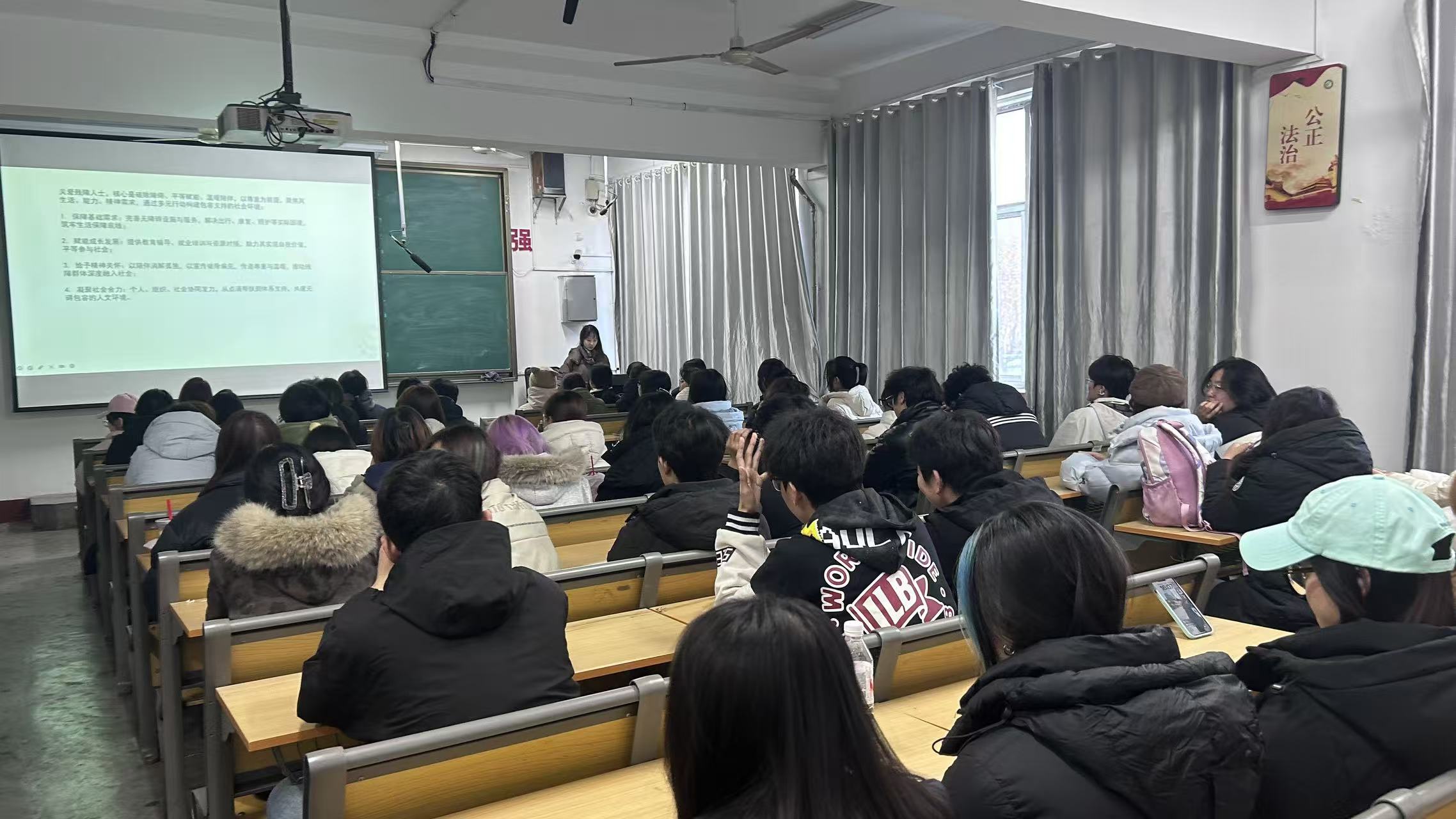 活动伊始,主持人详细讲解了残障人群的分类、生活中面临的实际困境,从出行不便、沟通障碍到社会参与机会不足等方面,层层递进地阐述了关爱残障群体的重要意义。随后播放的专题短片,用真实镜头记录了残障人士在学习、工作、生活中的坚守与努力,展示了他们突破身体局限、追求美好生活的动人故事,同时普及了无障碍设施的使用场景与帮扶残障人士的正确方式,让同学们对残障群体有了更全面、立体的认知。
