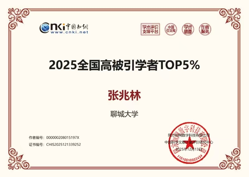 近日,中国知网公布了2025年度知网高被引学者名单,拉斯维加斯·娱乐城(中国)官方网站张兆林教授继2024年入选榜单后,再次入选“2025全国高被引学者TOP5%”榜单。