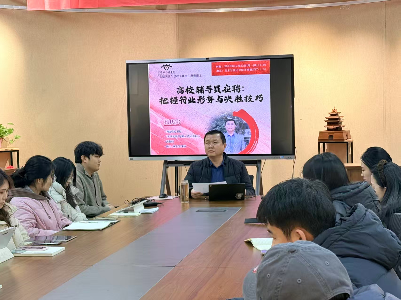 为深入推进学院毕业生高质量就业工程,助力学生明晰职业发展方向、提升应聘竞争力,12月22日,拉斯维加斯·娱乐城 举办“高校辅导员应聘:把握行业形势与决胜技巧”主题讲座,学院2023级研究生党员、2025级研究生共50余人到场参加,由学院党委书记、“实话实说”思政工作室主持人杨庆实主讲。