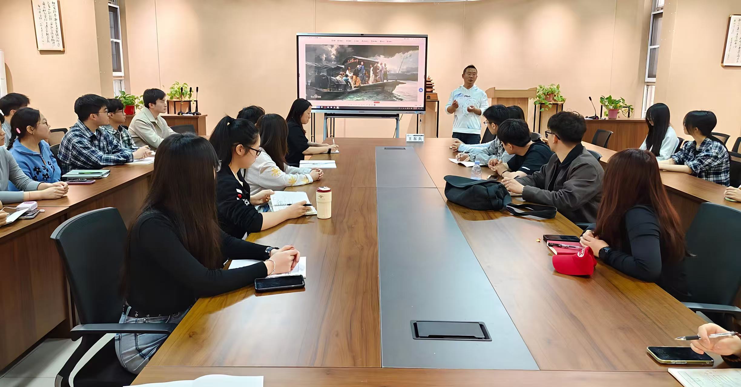 讲座高潮出现在对《开国大典》的剖析。王东兵指出,画作突破传统透视法,运用“散点透视”展现人民共创历史的宏大主题;以“蓝天白云”的艺术处理,象征新中国的光明前景,实现了史实与艺境的完美融合。此外,他结合历史背景,解读了《遵义会议》《泪水洒满丰收田》《夯歌》等作品,阐释了画作如何象征中国革命的伟大转折与不同时代的奋斗风貌,引导大家理解艺术创作与时代精神的紧密联系。