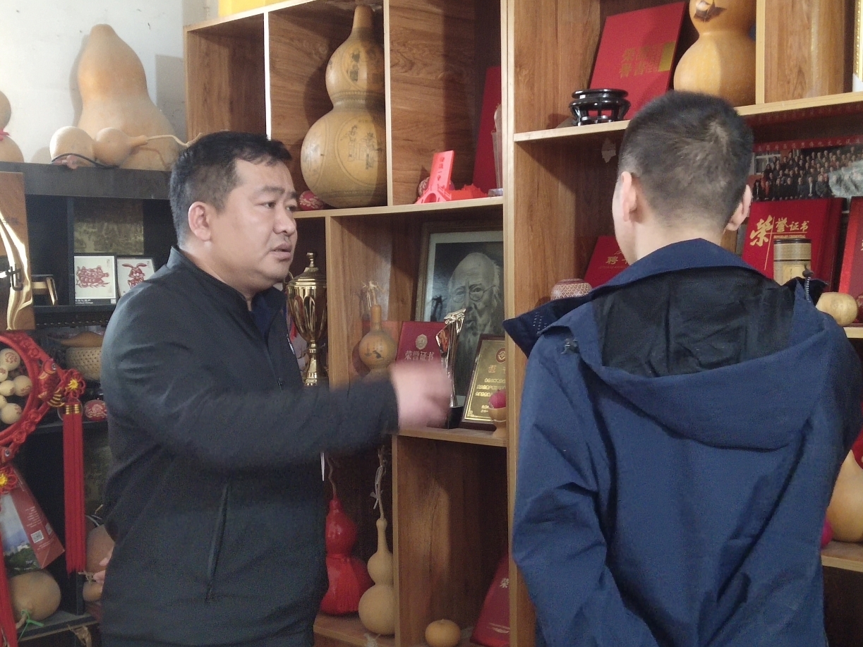 在王老师家堂屋摆放着多件葫芦雕刻作品,我们在观赏作品的同时不禁赞叹王老师高超的葫芦雕刻技艺。