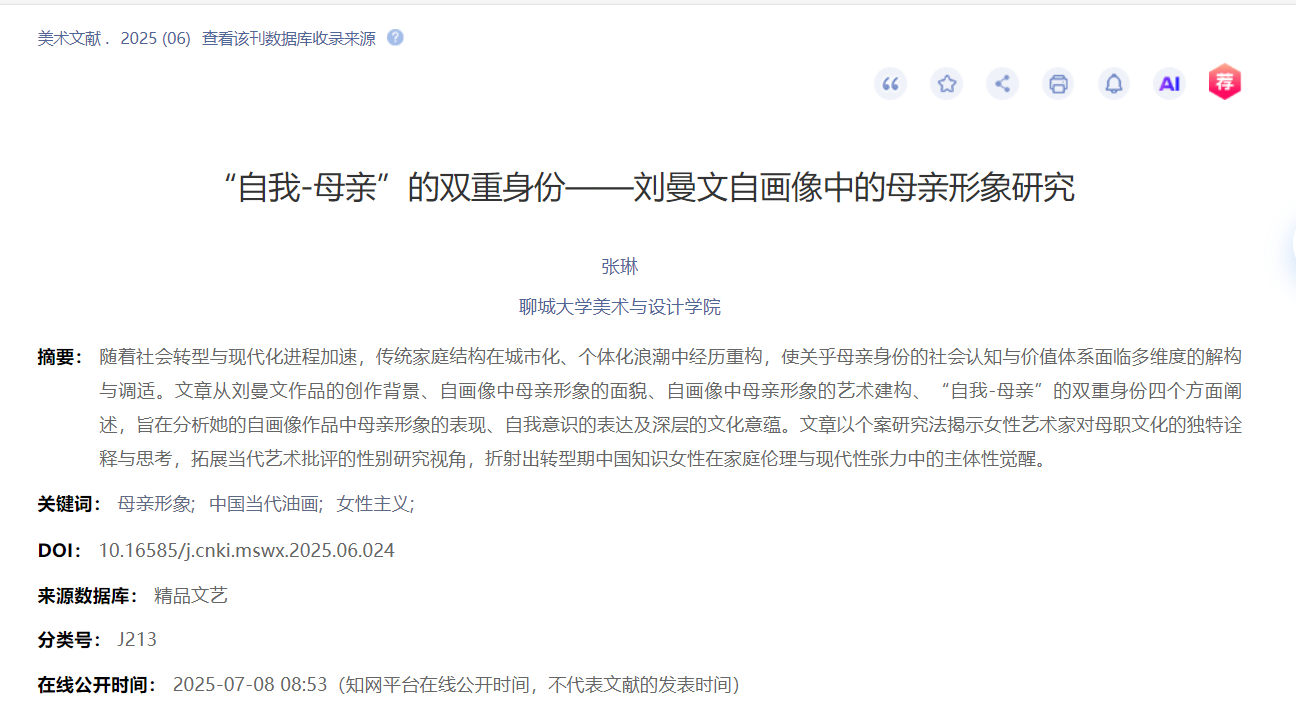 2025年7月论文《“自我—母亲”的双重身份——刘曼文自画像中的母亲形象研究》发表于《美术文献》;