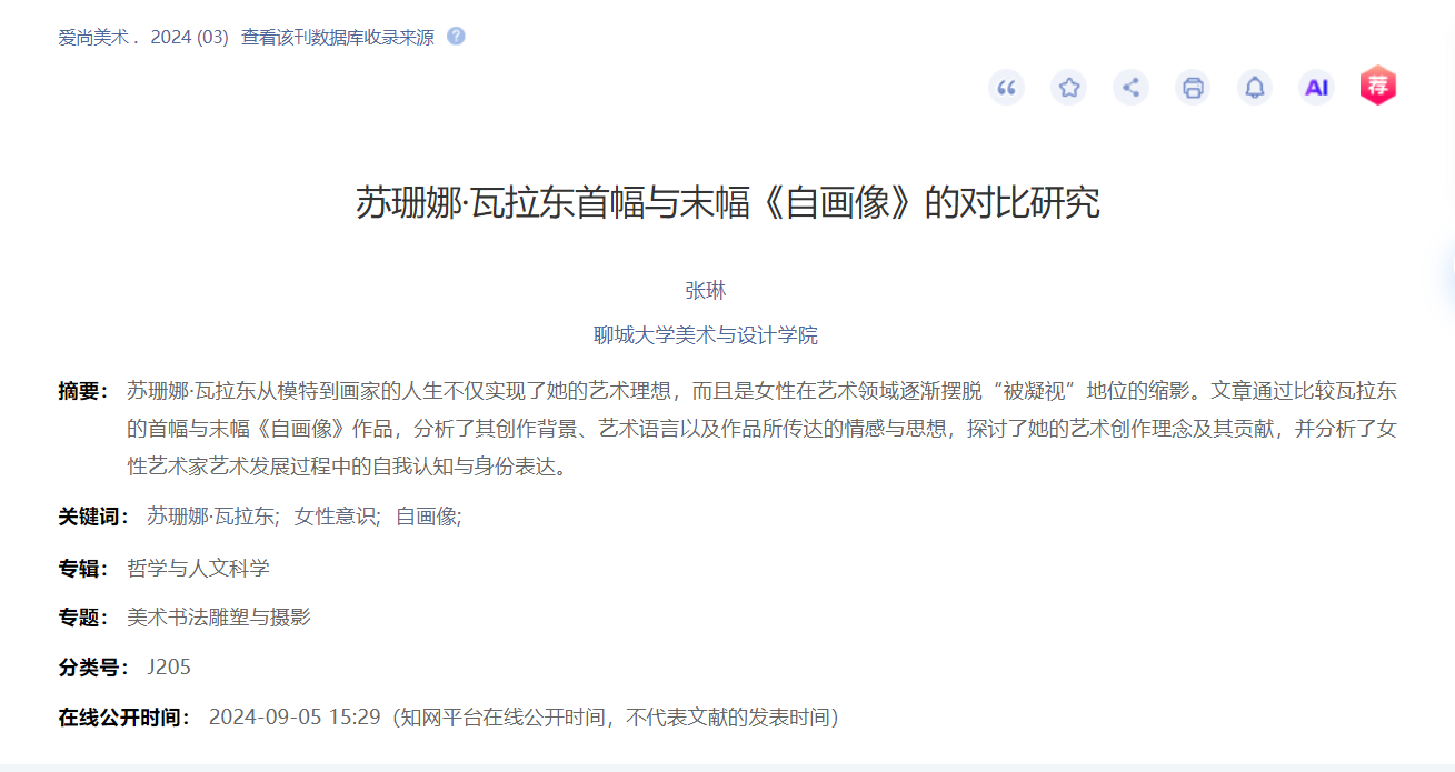 2024年6月论文《苏珊娜·瓦拉东首幅与末幅〈自画像〉对比研究》发表于《爱尚美术》。